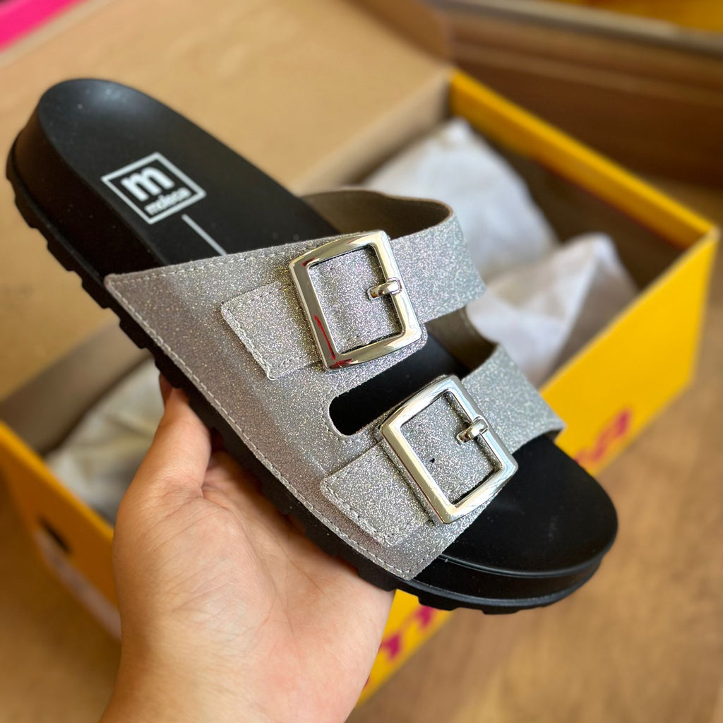 O destaque principal desse modelo é o glitter, um acabamento brilhante que cobre toda a sandália, criando um efeito luminoso e chamativo. O glitter adiciona um toque de sofisticação e diversão ao calçado, tornando-o uma opção perfeita para eventos noturnos, festas ou até mesmo para dar um toque especial a um look casual.
