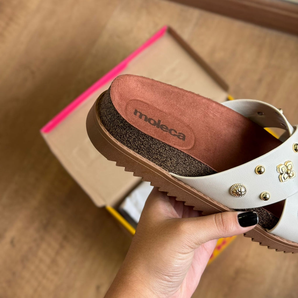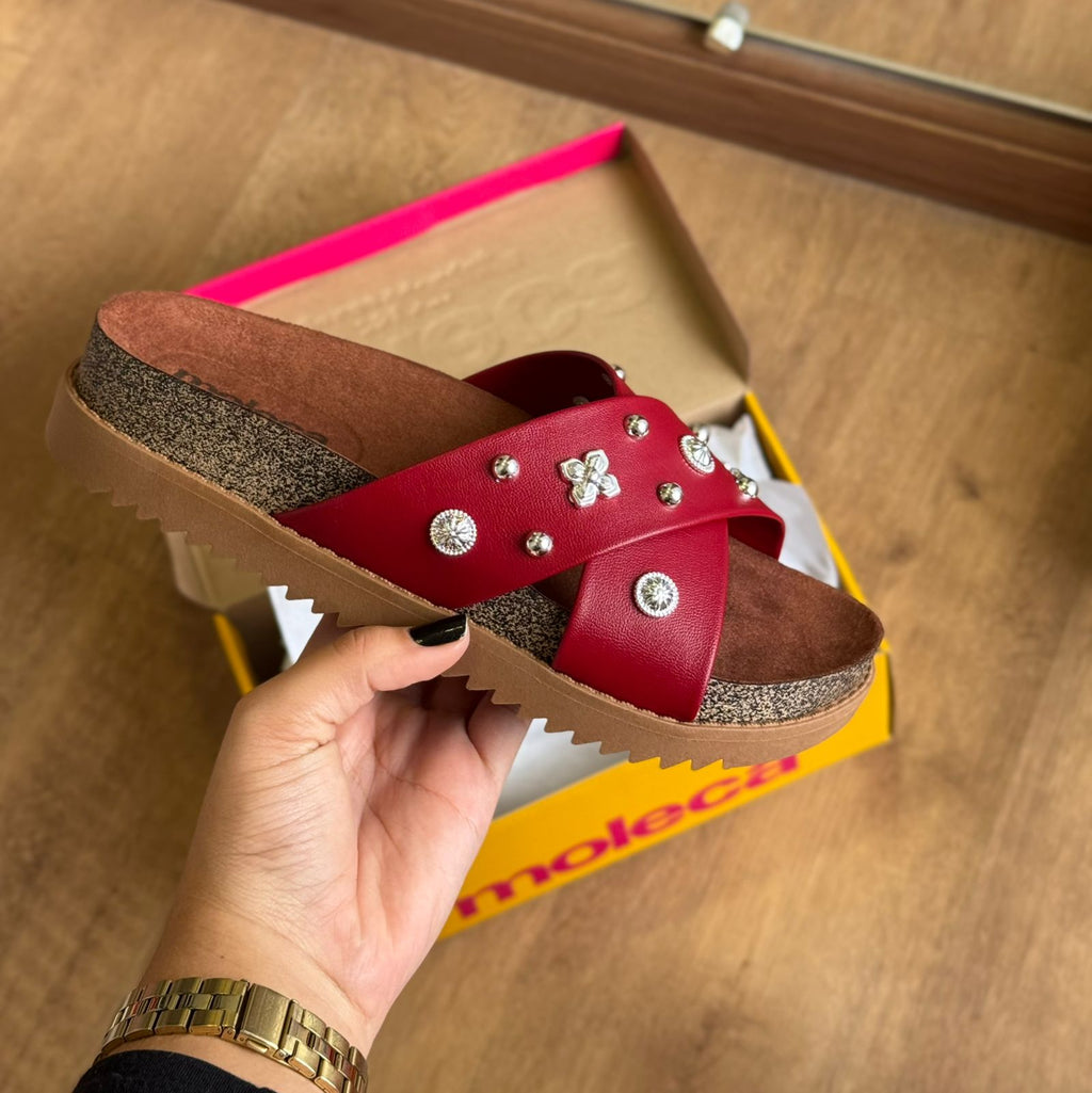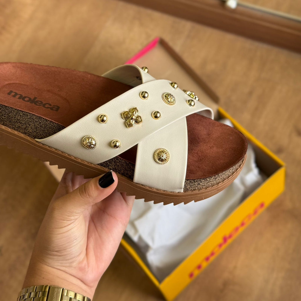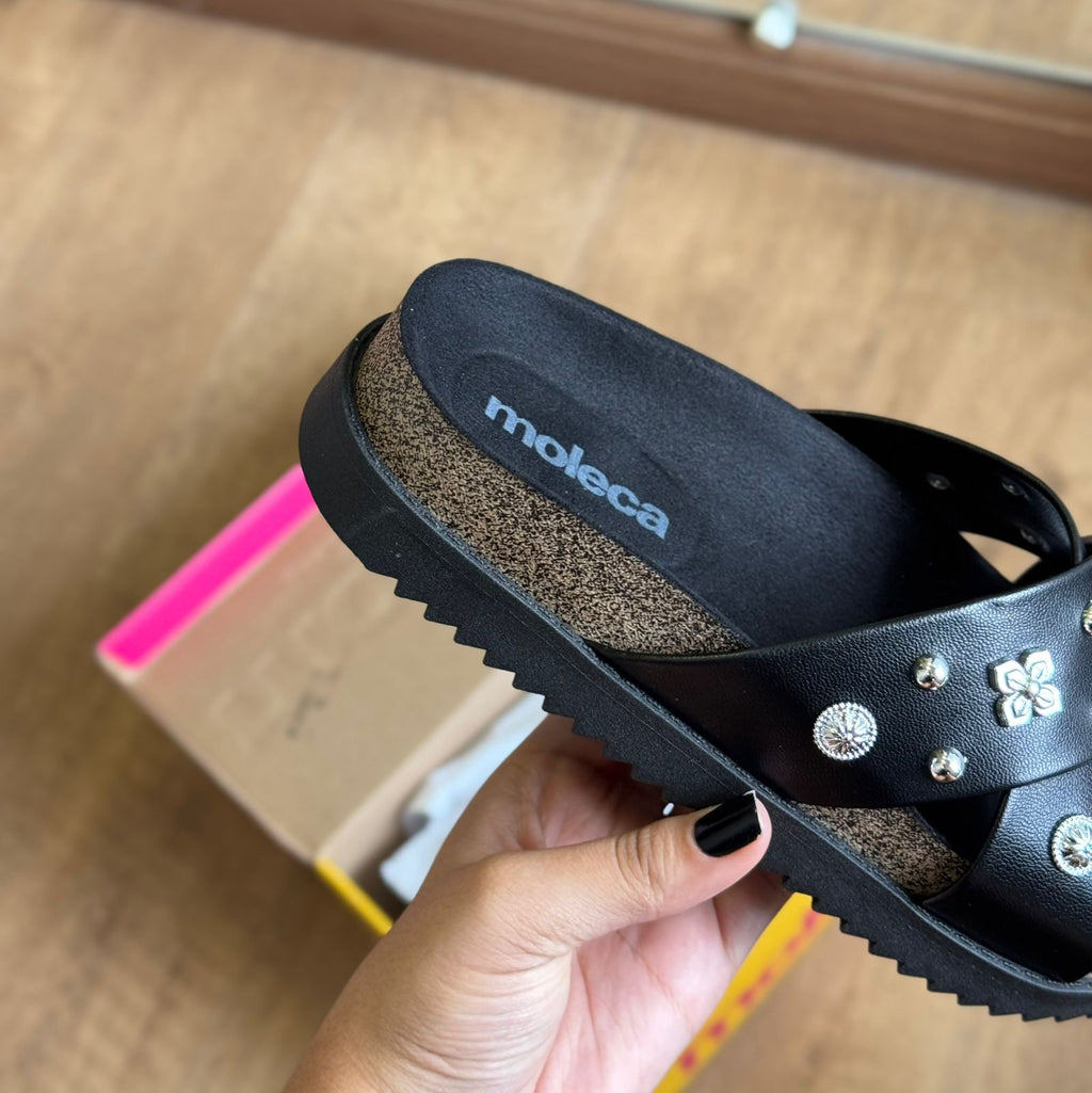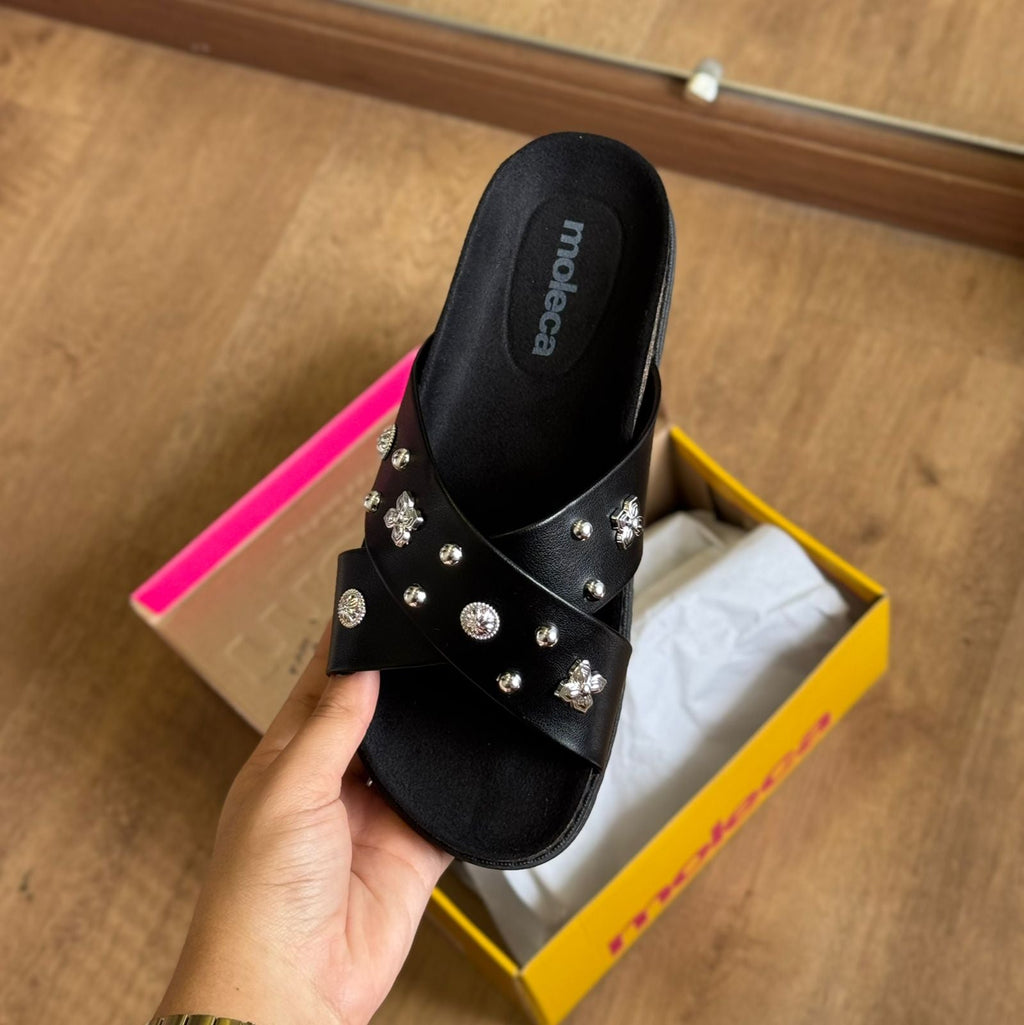 A Sandália Papete Moleca 5500.112 é a combinação perfeita de conforto e brilho para os dias em que você quer praticidade sem abrir mão do estilo. Com tiras em formato cruzado, seu design moderno ganha ainda mais destaque com a aplicação de pedrarias delicadas, que trazem um toque de elegância ao visual casual. O solado levemente tratorado garante estabilidade e leveza ao caminhar, enquanto o ajuste prático proporciona segurança no calce. Ideal para acompanhar sua rotina com atitude e um toque de glamour discreto que transforma qualquer look.